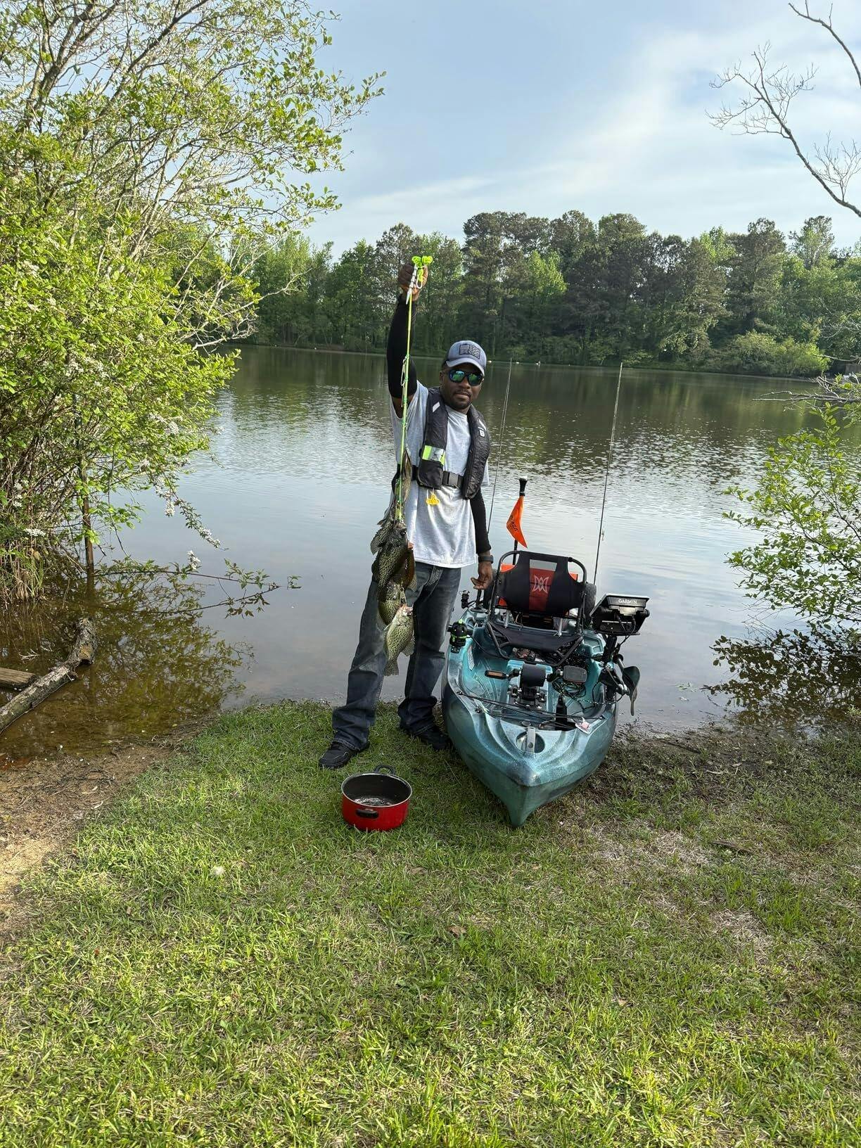 Person holding a large fish caught from a kayak on a lake with trees in the background